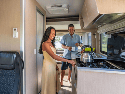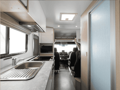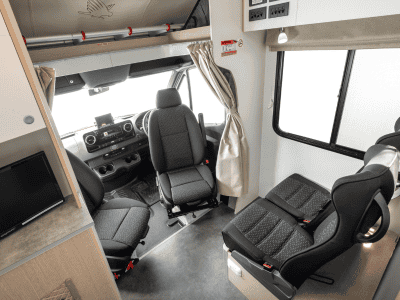 | Details | Make/Model: Mercedes or similar Transmission: Automatic Fuel: Diesel Fuel tank capacity: 71L Power steering: Yes Airbags: Yes ABS brakes: Yes Certified Self Contained Power supply (volts): 12V battery/240V mains/solar panel Fly screen Heating (Driver’s cab/Main Cabin): Yes / Diesel Fresh water tank: 97L Waste Water Tank: 97L Reversing camera, personal safe, front swivel seats, external storage locker |