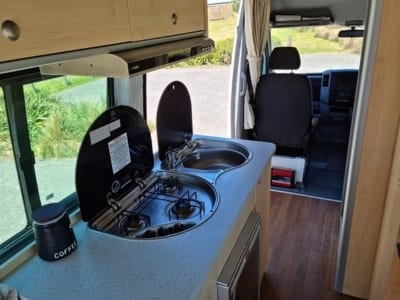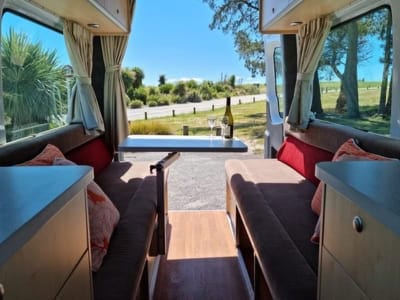 Its separate kitchen area is ideal for everyday use and offers protection from the elements, while the built-in shower and toilet ensure all your essential needs are met. Whether you’re relaxing during the day or settling in for the night, the interior transitions effortlessly to suit your needs. Generous under-seat storage compartments help keep your gear organized and out of sight. Complete with all necessary cooking amenities, the Tandem Deluxe is ready to make your New Zealand journey truly memorable.