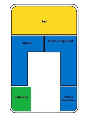 | Sleeps | 3 Adults Double bed: 1.35m x 2.1m Couch convert to single bed: 0.55m x 1.8m |