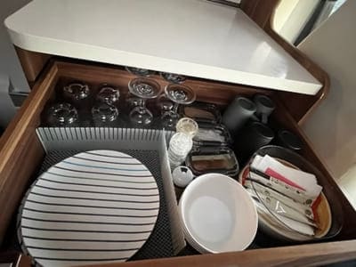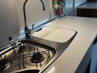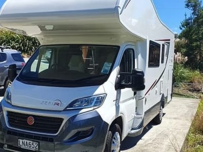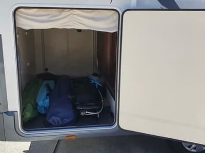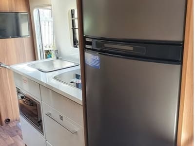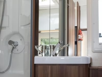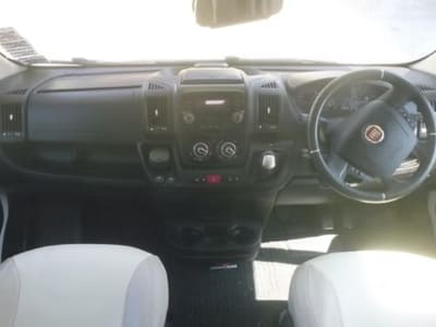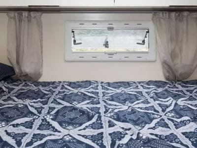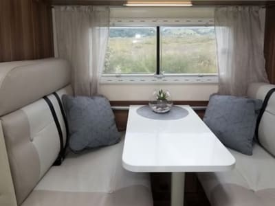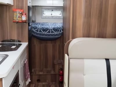 The Fiat Zefiro 295 features a rear double bed positioned above the storage compartment, an offside kitchen with a 149L fridge/freezer, three-burner gas hob, and gas oven, plus a nearside bathroom cubicle and a café-style dinette behind the passenger seat, with a queen-sized bed over the cab. It comes with a 4 m awning, two-bike rack, and a TV with satellite dish, and is fully equipped with utensils, crockery, cutlery, and cookware. Comfort is ensured by a gas heater, driver’s-cabin air conditioning, USB ports, reading lights, and generous storage space, while the powerful 2.0 L turbo diesel engine includes Bluetooth, cruise control, a reversing camera, and other convenient features.